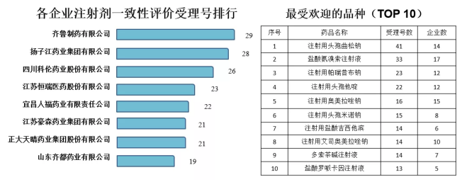 從各企業(yè)注射劑一致性評(píng)價(jià)受理號(hào)排行(圖1)及最受歡迎的注射劑品種可以看出,齊魯制藥、揚(yáng)子江、四川科倫、江蘇恒瑞、宜昌人福、江蘇豪森以及正大天晴注射劑的受理號(hào)均超過了20個(gè)。另外,在最受歡迎TOP10名單中,以抗炎抗感染類大容量品種最受大家青睞,競爭激烈。