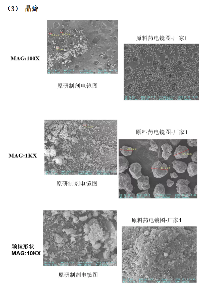 結(jié)果:隨著電鏡掃描放大倍數(shù)的增加,可以更加清楚地看出原料藥和原研制劑的差異:原研制劑的顆粒明顯小于原料藥,而廠家1原料藥的表面更加緊實(shí),所以溶解時(shí)間也會(huì)更長。