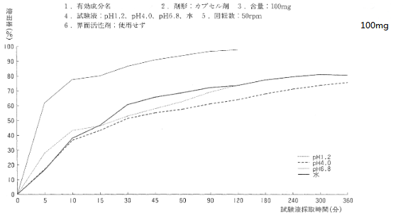 文獻信息:日本橙皮書中,檢索到該膠囊100mg各介質中的溶出曲線如下: