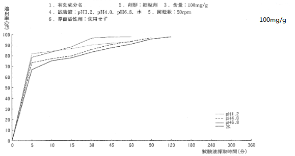 在相同的溶出條件下,其細粒劑100mg各介質中的溶出曲線如下: