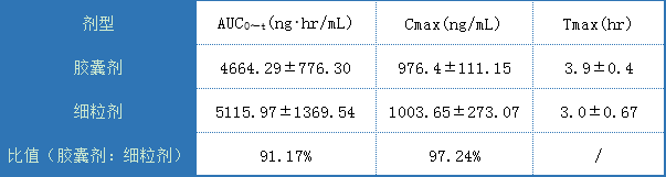 從日本IF文件中,并沒有直接獲得膠囊劑和細粒劑的藥動學參數(shù)對比,但我們從日本某公司的仿制藥IF文件中,可分別獲得仿制的膠囊與原研膠囊的藥動學對比,以及仿制的細粒劑與原研細粒劑的藥動學對比,具體如下: