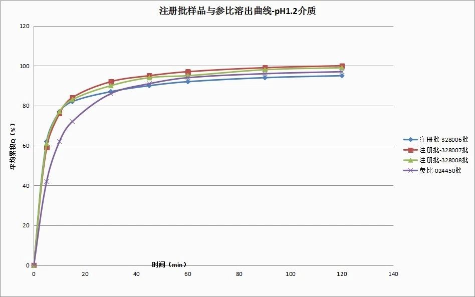 本品種仿制藥開發(fā)的過程,經(jīng)過逐級放大,工藝驗證三批樣品在pH1.2介質中的溶出略快于BE批次的參比制劑,三批樣品與參比的相似因子均未達到50,曲線圖如下: