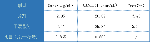 上表給出了給藥劑量均為200mg的前提下,片劑、糖漿、干混懸劑之間的藥動學參數(shù)對比,由于糖漿劑劑型比較復雜,受糖漿粘度影響,可能影響體內吸收,暫不做考慮,單純對比片劑以及干混懸劑的藥動學參數(shù),如下: