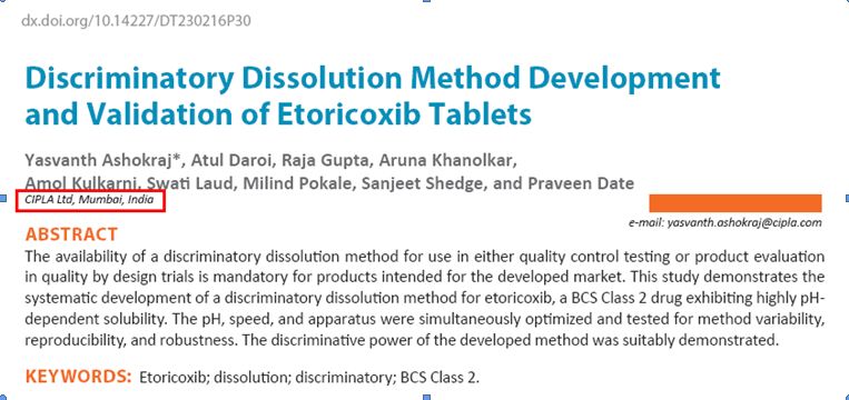 2016年,印度同仁對溶出度技術的運用已日趨成熟,開始公開撰文?!度艹龆仍囼灱夹g雜志(DissolutionTechnologies)》在該年5月發(fā)表了一篇由印度CIPLA公司研發(fā)人員撰寫的“以依托考昔片為例:如何開發(fā)適度區(qū)分力的溶出方法”文章。