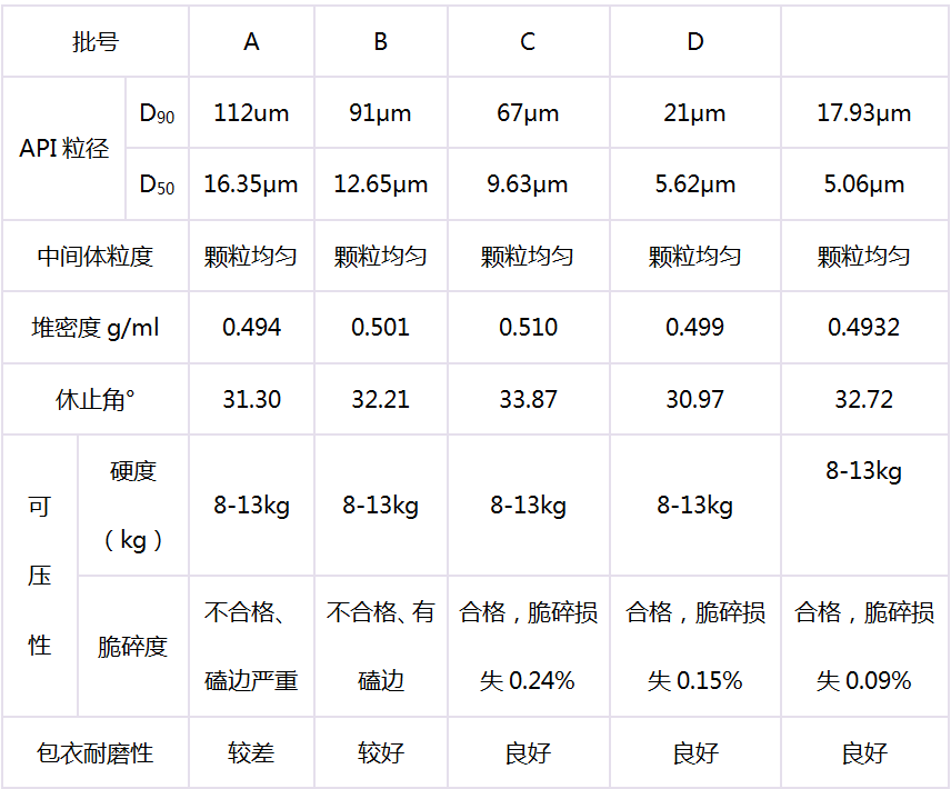 項目A原料藥粒徑范圍對可壓性考察結(jié)果