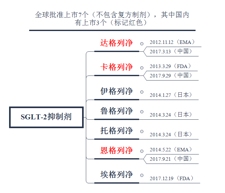 SGLT-2抑制劑是一種近年來新型口服降糖藥的后起之秀,目前全球共批準(zhǔn)7個(gè)品種上市(不包含復(fù)方制劑),其中國內(nèi)上市3個(gè),如下圖所示: