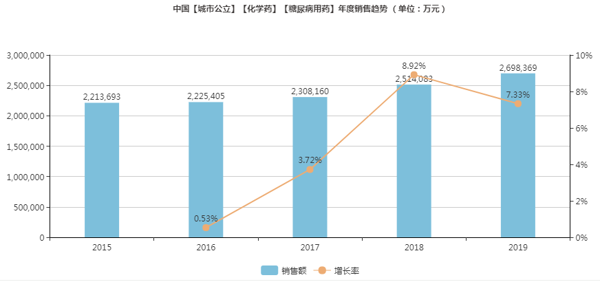 糖尿病是全球普遍流行的慢性疾病之一,據(jù)統(tǒng)計(jì),目前全球約有4.63億人患有糖尿病。我國糖尿病人數(shù)高達(dá)1.14億,患病率近年維持在11%左右。據(jù)米內(nèi)網(wǎng)統(tǒng)計(jì)數(shù)據(jù)顯示,2019年中國城市公立醫(yī)院終端糖尿病治療藥物市場規(guī)模約270億元(渠道格局占比47.19%),測算全國醫(yī)院市場規(guī)模高達(dá)572億元。