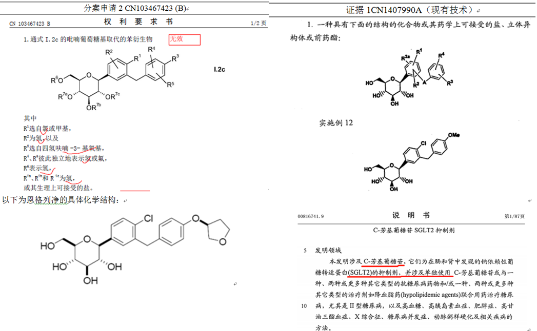 分案2(423B)無效基于的主要理由是不符合專利第22條第3款創(chuàng)造性的規(guī)定,采用的證據(jù)為CN1407990A,該專利中公開了一種具有SGLT-2抑制活性的式I結(jié)構(gòu)吡喃葡萄糖取代的苯衍生物,并且具體公開了實(shí)施例12的化合物。此外,證據(jù)1還公開了上述化合物為在腸和腎中的鈉依賴型葡萄糖轉(zhuǎn)運(yùn)蛋白SGLT-2的抑制劑。