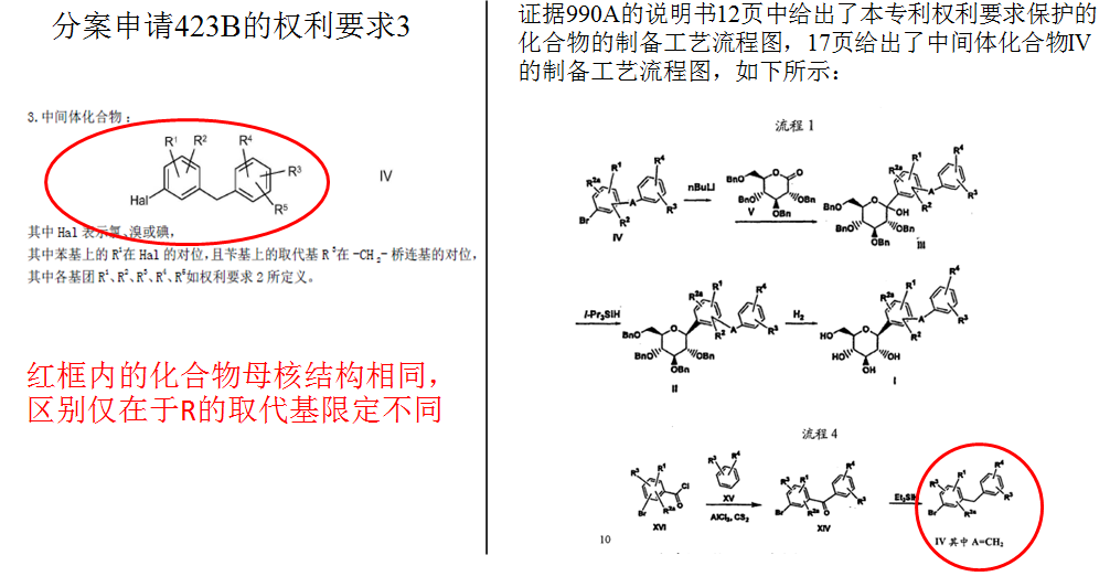 ?分案2:423B權(quán)1保護(hù)涵蓋恩格列凈在內(nèi)結(jié)構(gòu)通式化合物,保護(hù)范圍大于分案581和129,從權(quán)2保護(hù)制備路線;