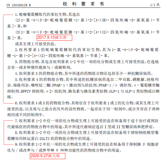 但上述專利先后均被國內(nèi)企業(yè)以個(gè)人名義進(jìn)行了部分無效,部分無效后的專利只保護(hù)制備方法,不再保護(hù)恩格列凈化合物和用途,如下所示: