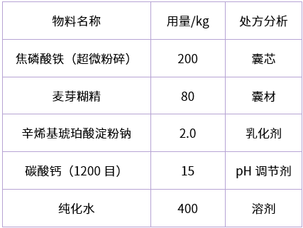 由于焦磷酸鐵在食品營養(yǎng)強化中用途廣用量大,結(jié)合工業(yè)化方便、經(jīng)濟(jì)的生產(chǎn)實際特點,本人在生產(chǎn)實踐中采用噴霧干燥法,以糖類物質(zhì)為壁材,采用微膠囊化技術(shù)對普通焦磷酸鐵原料進(jìn)行包埋處理,處理后的焦磷酸鐵性狀呈現(xiàn)小顆粒狀細(xì)粉,流散性好,加工性能(混合均勻性)得以提高,同時焦磷酸鐵經(jīng)過微膠囊化包埋處理,避免了與植物蛋白直接接觸誘發(fā)酸敗。