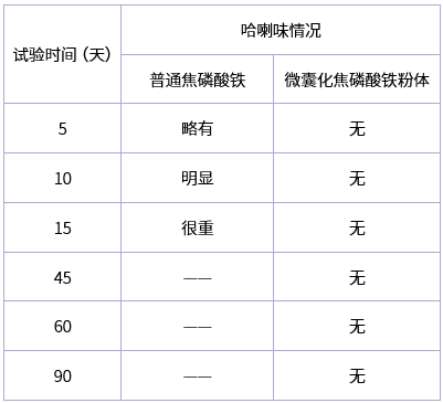 微囊化焦磷酸鐵粉體可大大延長含植物蛋白類食品出現(xiàn)哈喇味的時間。