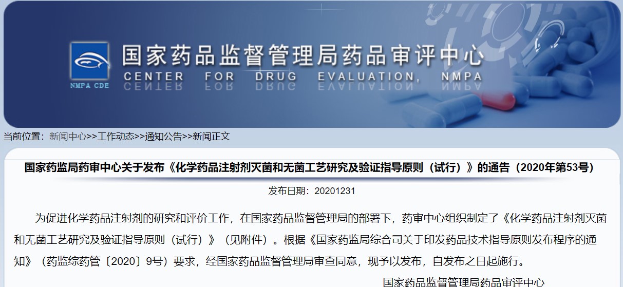 關(guān)于發(fā)布《化學(xué)藥品注射劑滅菌和無(wú)菌工藝研究及驗(yàn)證指導(dǎo)原則(試行)》的通告(2020年第53號(hào))