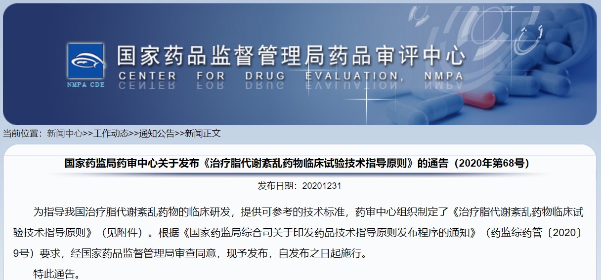 關(guān)于發(fā)布《治療脂代謝紊亂藥物臨床試驗(yàn)技術(shù)指導(dǎo)原則》的通告(2020年第68號(hào))