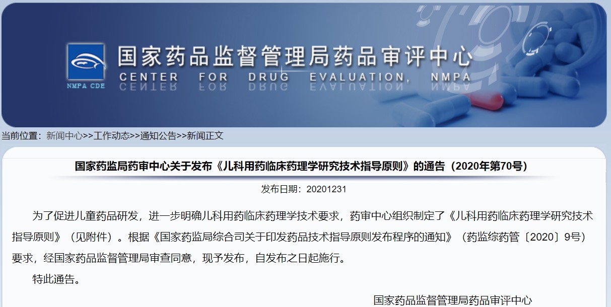 關(guān)于發(fā)布《兒科用藥臨床藥理學(xué)研究技術(shù)指導(dǎo)原則》的通告(2020年第70號(hào))
