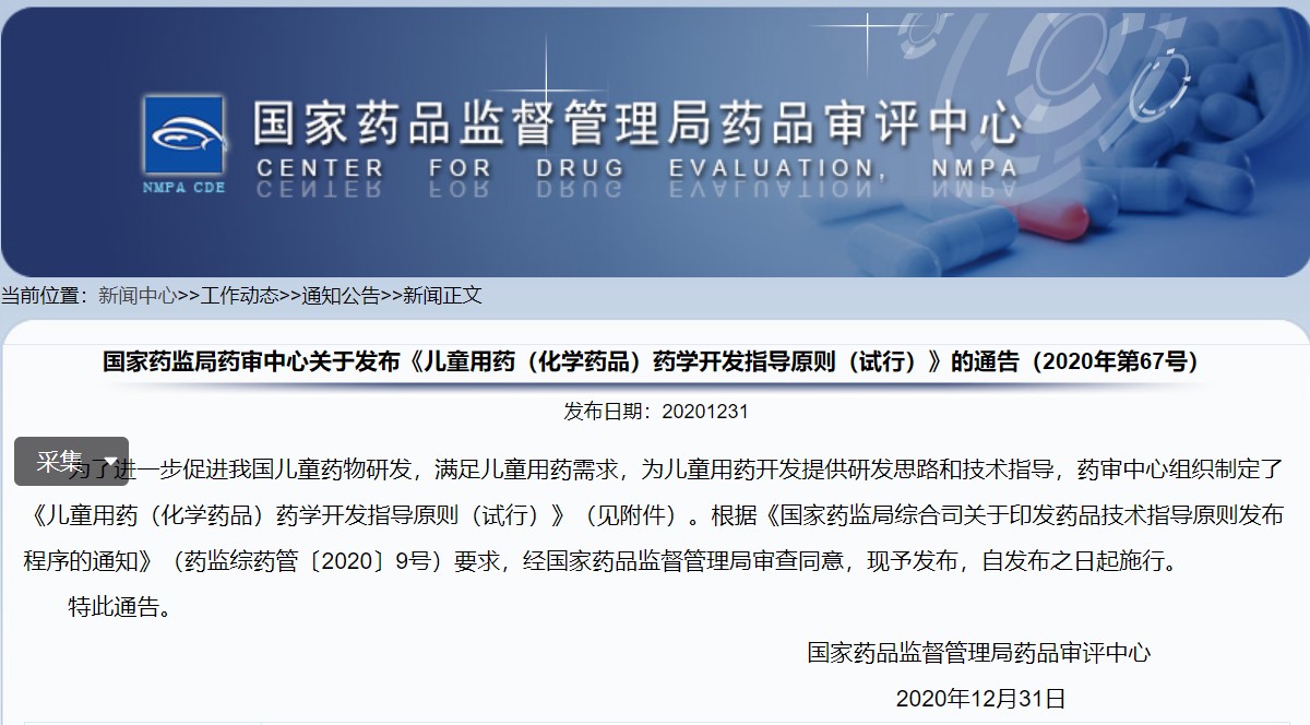 關(guān)于發(fā)布《兒童用藥(化學(xué)藥品)藥學(xué)開(kāi)發(fā)指導(dǎo)原則(試行)》的通告(2020年第67號(hào))