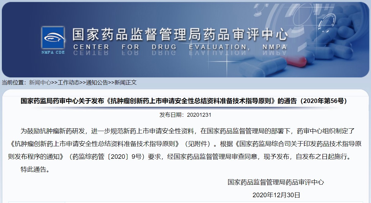 關(guān)于發(fā)布《抗腫瘤創(chuàng)新藥上市申請(qǐng)安全性總結(jié)資料準(zhǔn)備技術(shù)指導(dǎo)原則》的通告(2020年第56號(hào))
