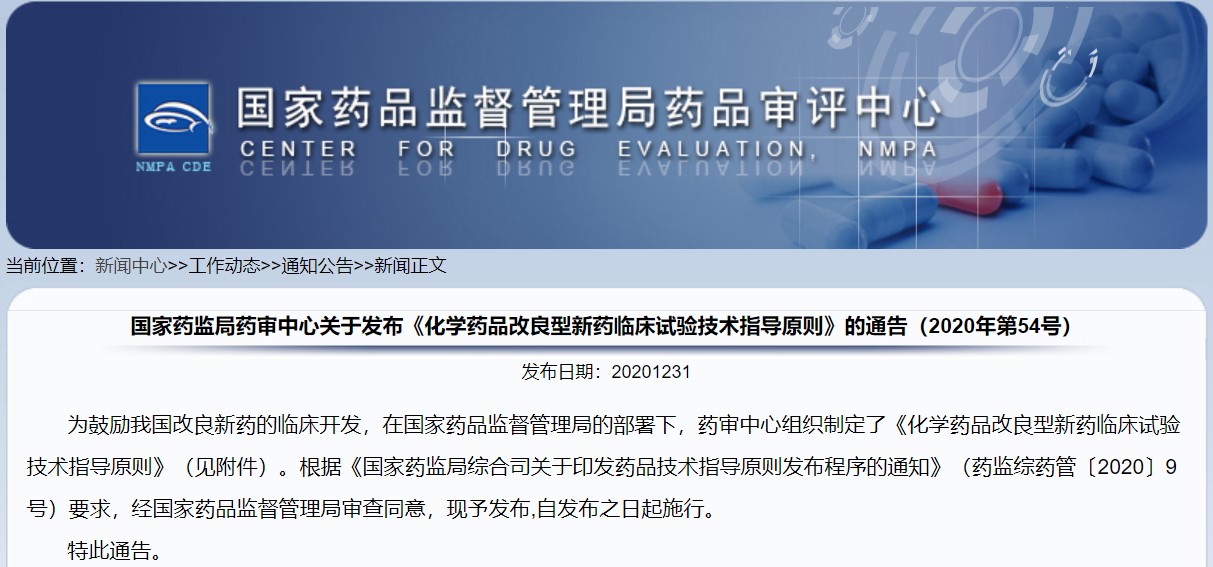 關(guān)于發(fā)布《化學(xué)藥品改良型新藥臨床試驗(yàn)技術(shù)指導(dǎo)原則》的通告(2020年第54號(hào))