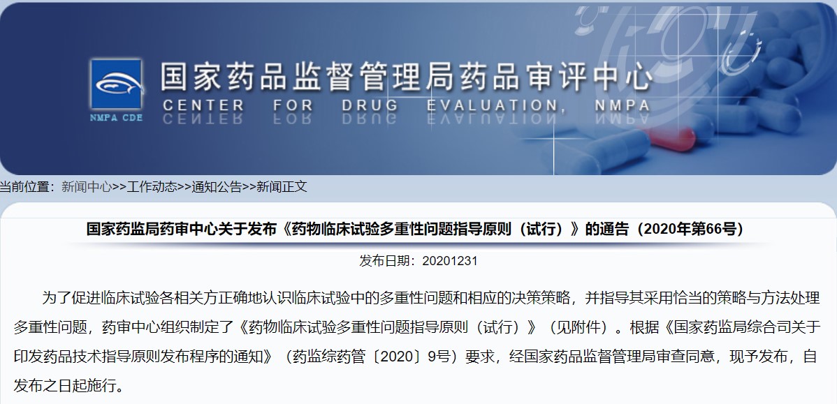 關(guān)于發(fā)布《藥物臨床試驗(yàn)多重性問(wèn)題指導(dǎo)原則(試行)》的通告(2020年第66號(hào))