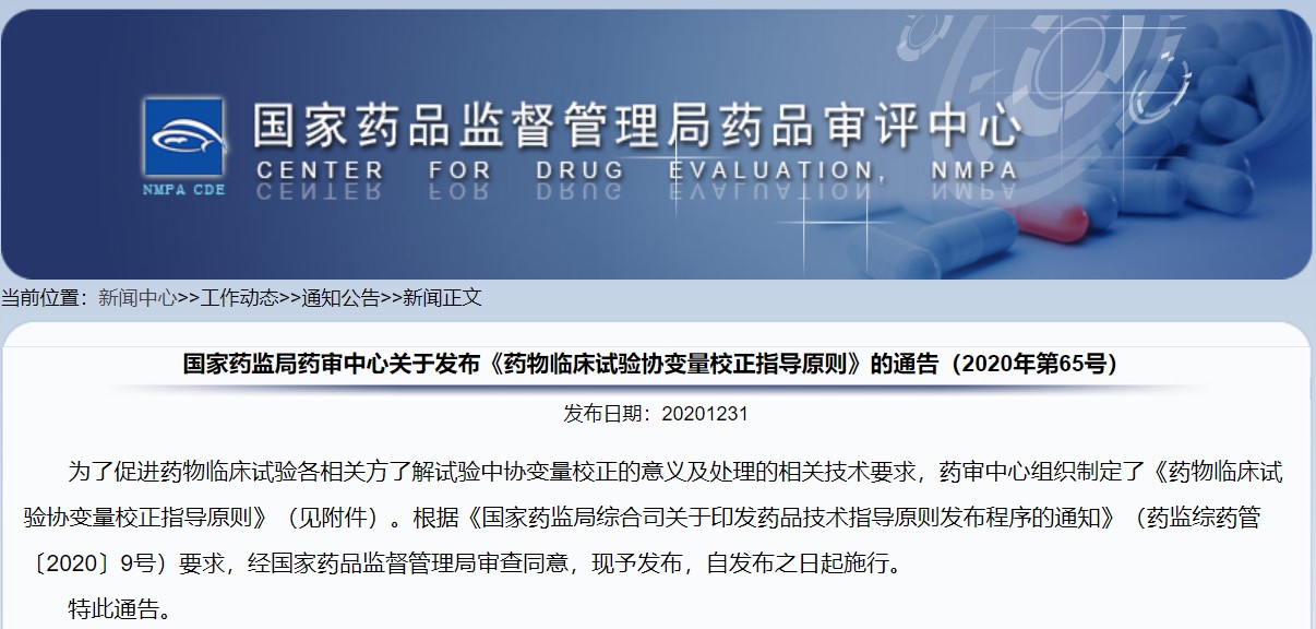 關(guān)于發(fā)布《藥物臨床試驗(yàn)協(xié)變量校正指導(dǎo)原則》的通告(2020年第65號(hào))