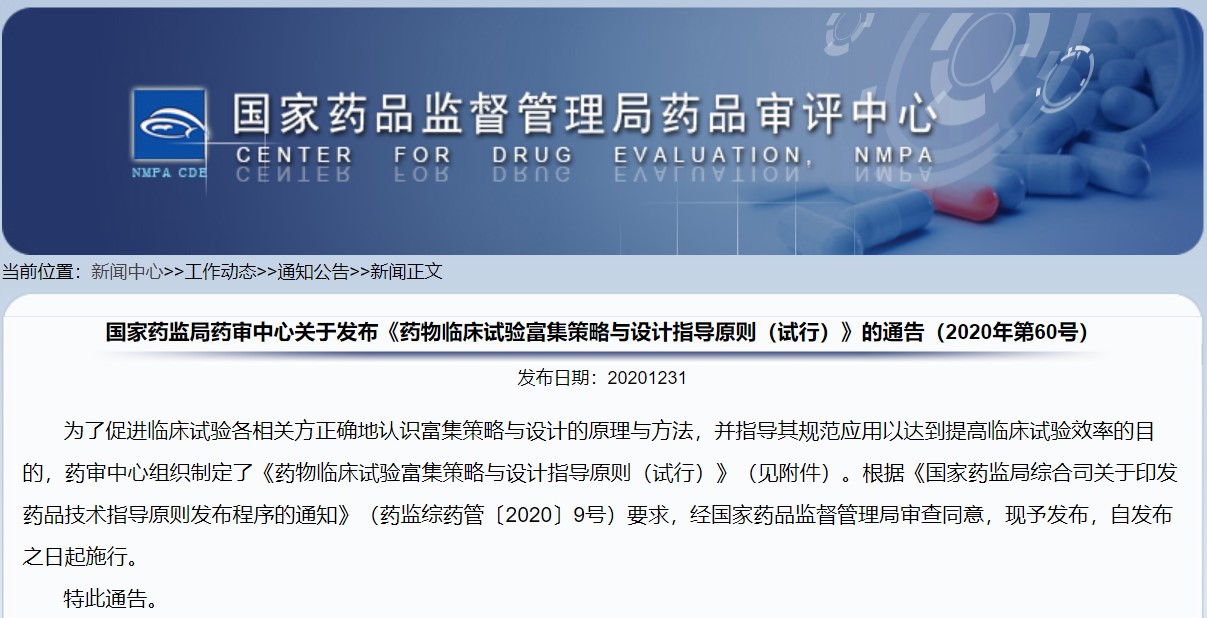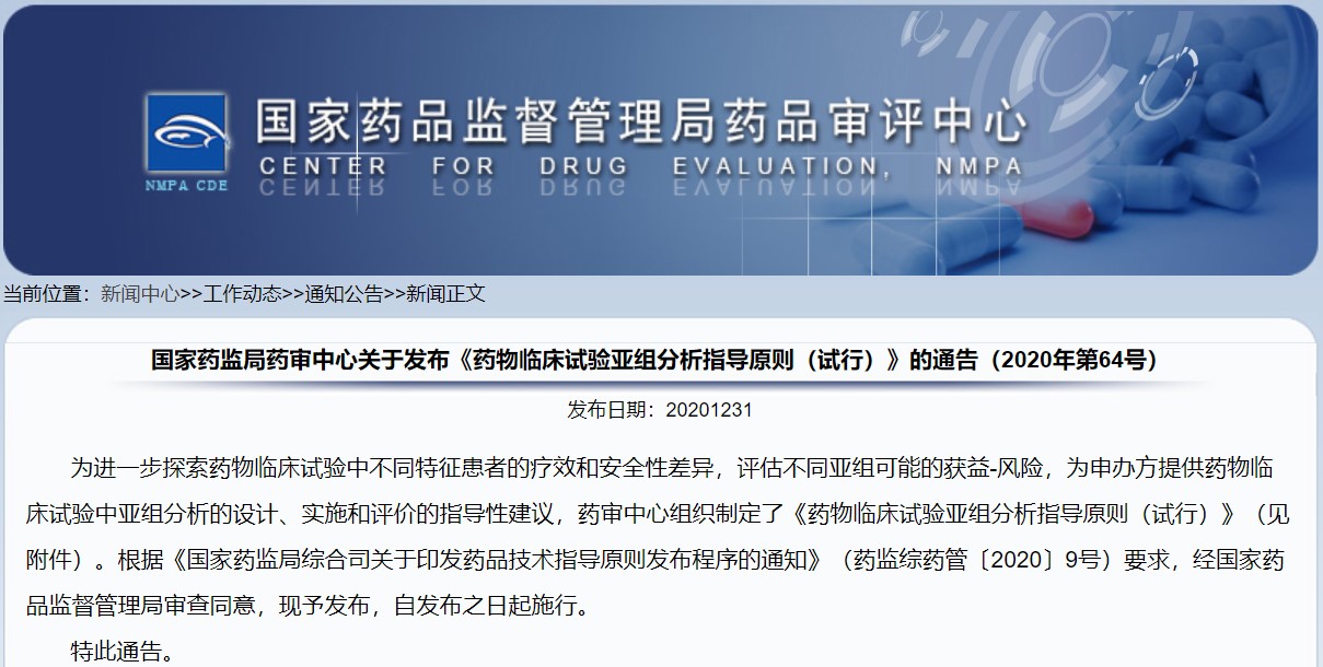 關(guān)于發(fā)布《藥物臨床試驗(yàn)亞組分析指導(dǎo)原則(試行)》的通告(2020年第64號(hào))