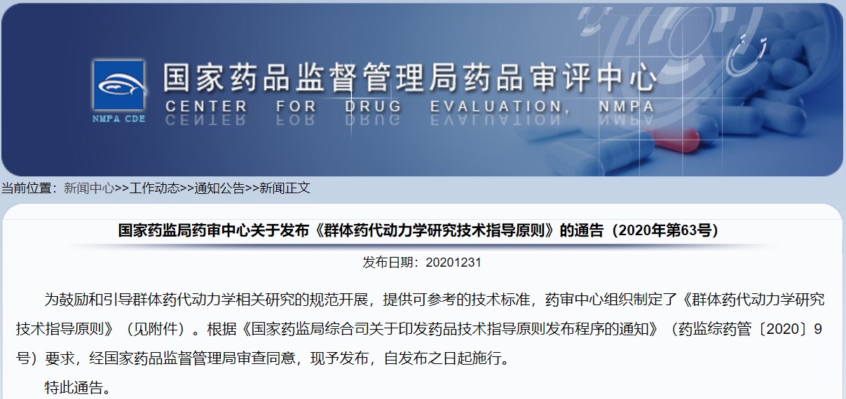 關(guān)于發(fā)布《群體藥代動(dòng)力學(xué)研究技術(shù)指導(dǎo)原則》的通告(2020年第63號(hào))