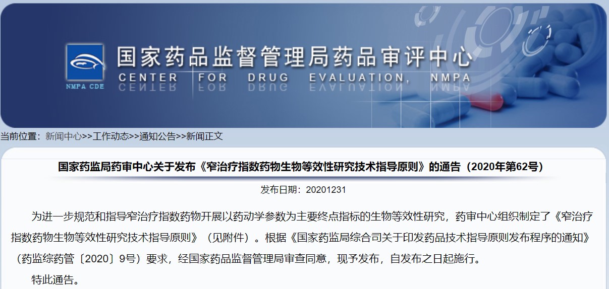 關(guān)于發(fā)布《窄治療指數(shù)藥物生物等效性研究技術(shù)指導(dǎo)原則》的通告(2020年第62號(hào))
