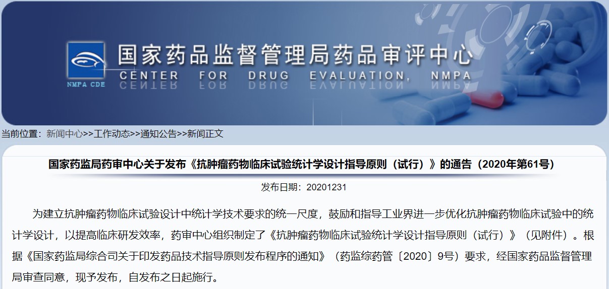 關(guān)于發(fā)布《抗腫瘤藥物臨床試驗(yàn)統(tǒng)計(jì)學(xué)設(shè)計(jì)指導(dǎo)原則(試行)》的通告(2020年第61號(hào))