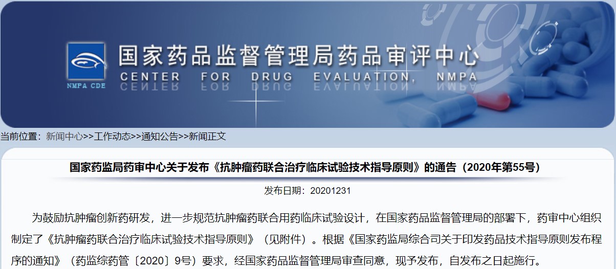 關(guān)于發(fā)布《抗腫瘤藥聯(lián)合治療臨床試驗(yàn)技術(shù)指導(dǎo)原則》的通告(2020年第55號(hào))