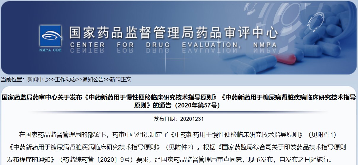 關(guān)于發(fā)布《中藥新藥用于慢性便秘臨床研究技術(shù)指導(dǎo)原則》《中藥新藥用于糖尿病腎臟疾病臨床研究技術(shù)指導(dǎo)原則》的通告(2020年第57號(hào))