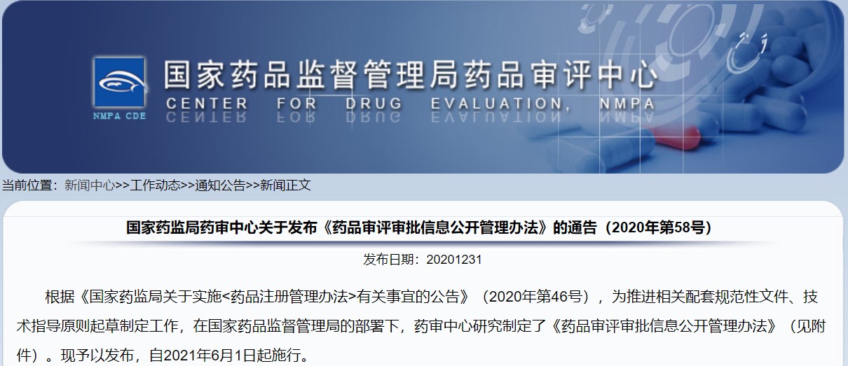 關(guān)于發(fā)布《藥品審評(píng)審批信息公開(kāi)管理辦法》的通告(2020年第58號(hào))