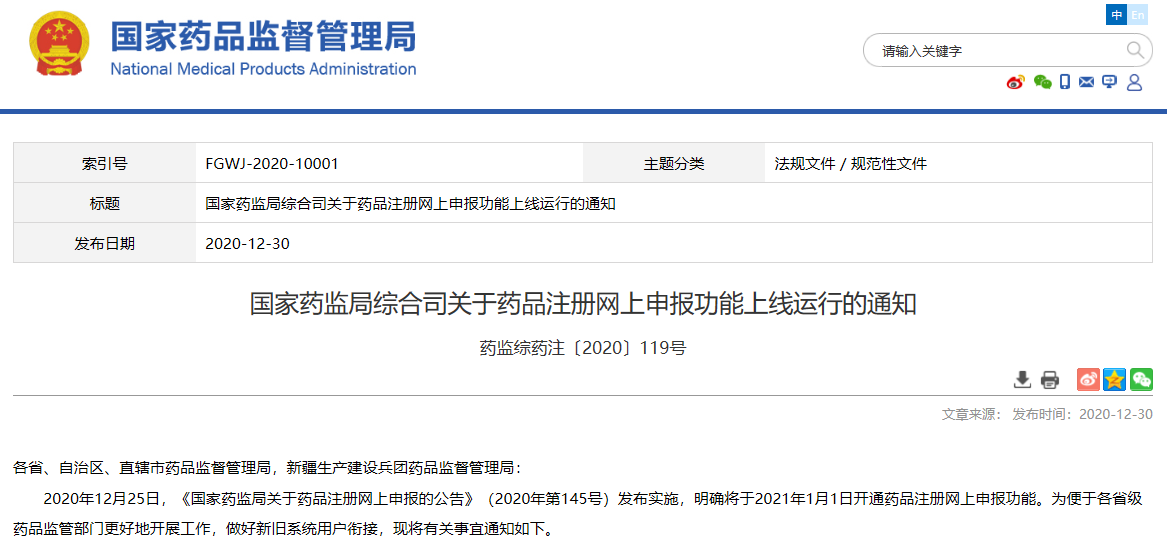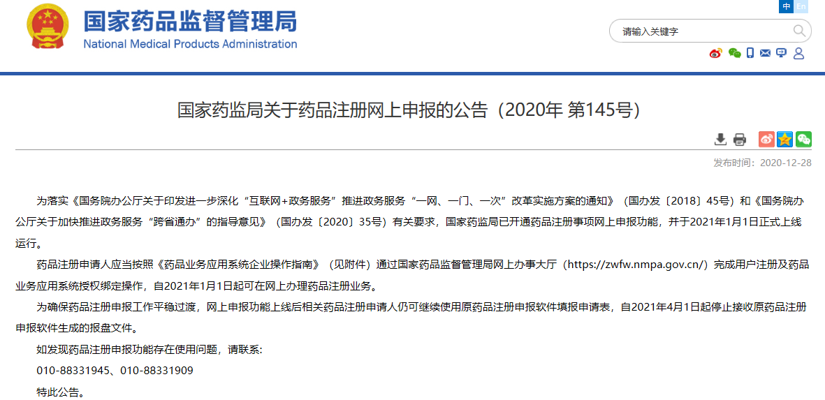 關(guān)于藥品注冊(cè)網(wǎng)上申報(bào)的公告(2020年 第145號(hào))