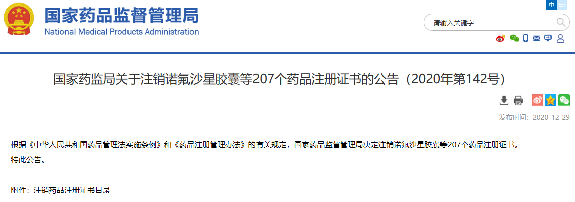 關(guān)于注銷諾氟沙星膠囊等207個(gè)藥品注冊(cè)證書(shū)的公告(2020年第142號(hào))
