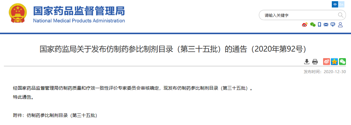 關(guān)于發(fā)布仿制藥參比制劑目錄(第三十五批)的通告(2020年第92號(hào))