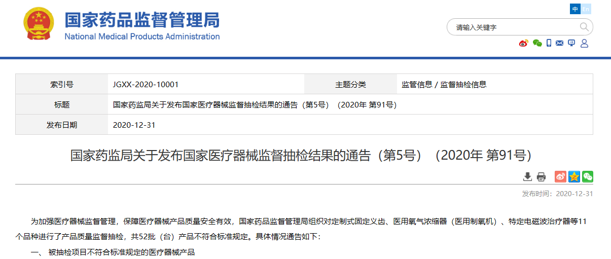 關(guān)于發(fā)布國(guó)家醫(yī)療器械監(jiān)督抽檢結(jié)果的通告(第5號(hào))(2020年 第91號(hào))