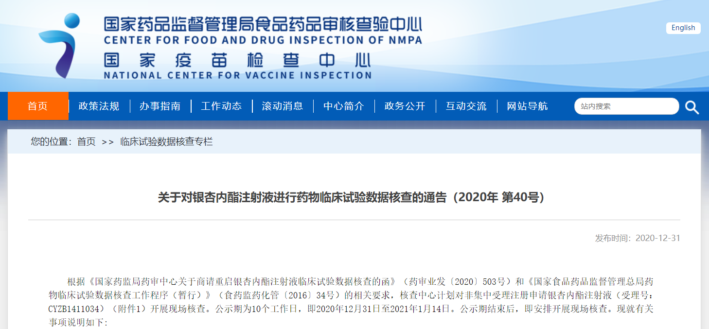 關(guān)于對(duì)銀杏內(nèi)酯注射液進(jìn)行藥物臨床試驗(yàn)數(shù)據(jù)核查的通告(2020年 第40號(hào))