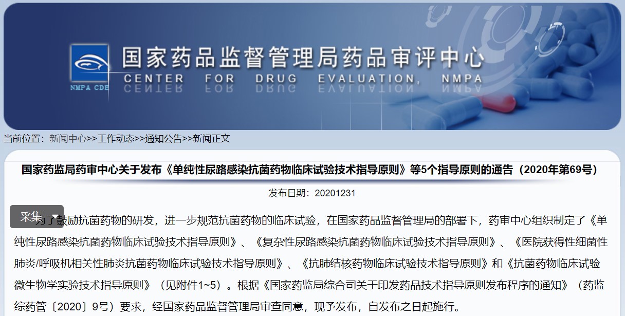 關(guān)于發(fā)布《單純性尿路感染抗菌藥物臨床試驗(yàn)技術(shù)指導(dǎo)原則》等5個(gè)指導(dǎo)原則的通告(2020年第69號(hào))