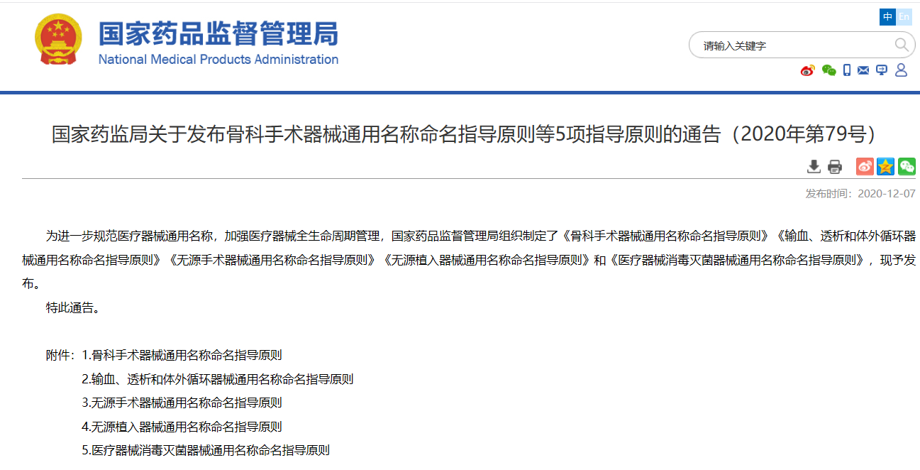 為進(jìn)一步規(guī)范醫(yī)療器械通用名稱,加強(qiáng)醫(yī)療器械全生命周期管理,國(guó)家藥品監(jiān)督管理局組織制定并發(fā)布《骨科手術(shù)器械通用名稱命名指導(dǎo)原則》《輸血、透析和體外循環(huán)器械通用名稱命名指導(dǎo)原則》《無(wú)源手術(shù)器械通用名稱命名指導(dǎo)原則》《無(wú)源植入器械通用名稱命名指導(dǎo)原則》和《醫(yī)療器械消毒滅菌器械通用名稱命名指導(dǎo)原則》。