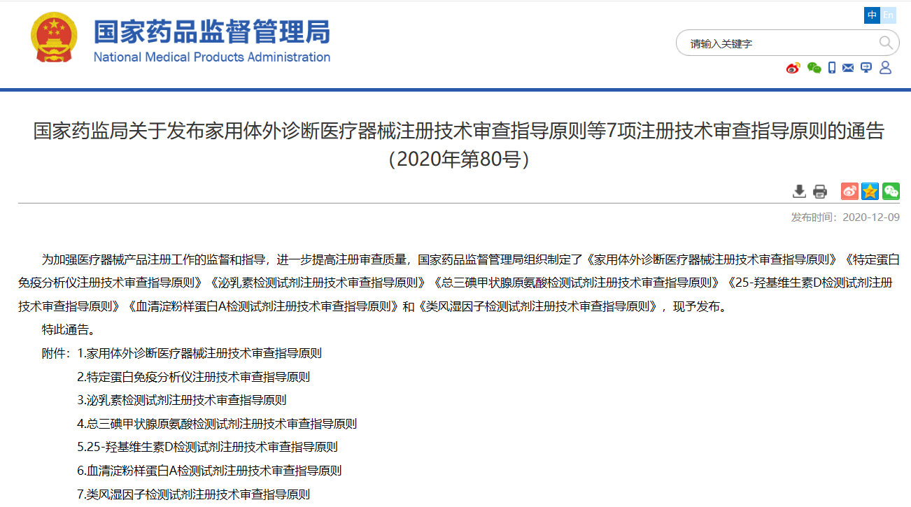 關(guān)于發(fā)布家用體外診斷醫(yī)療器械注冊(cè)技術(shù)審查指導(dǎo)原則等7項(xiàng)注冊(cè)技術(shù)審查指導(dǎo)原則的通告(2020年第80號(hào))