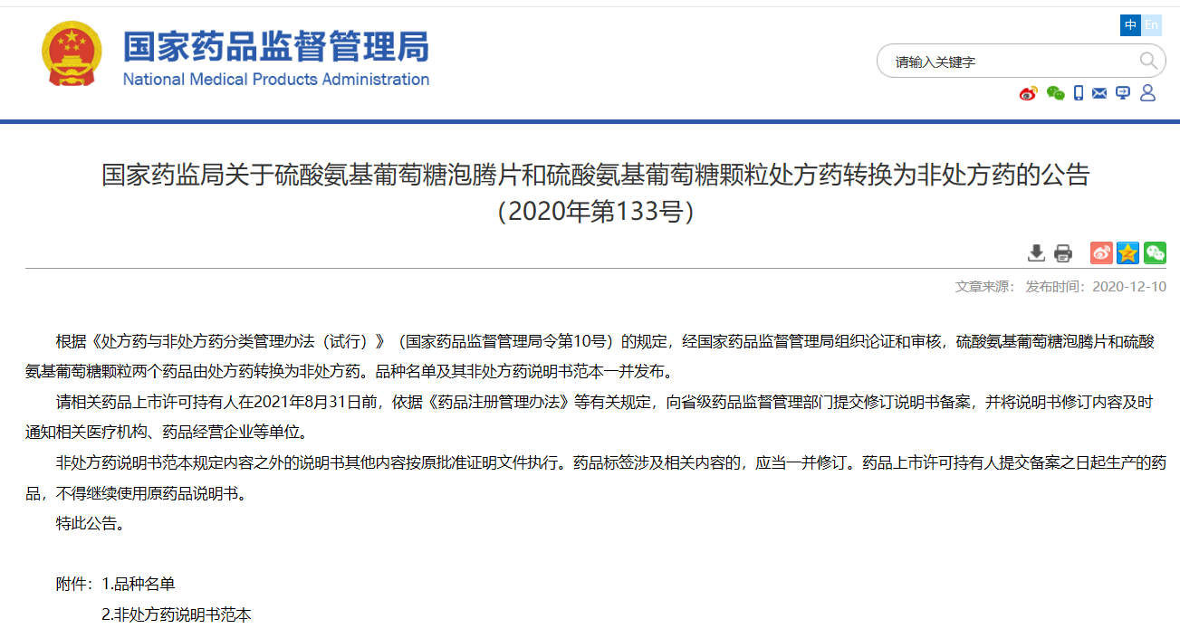 關(guān)于硫酸氨基葡萄糖泡騰片和硫酸氨基葡萄糖顆粒處方藥轉(zhuǎn)換為非處方藥的公告(2020年第133號(hào))