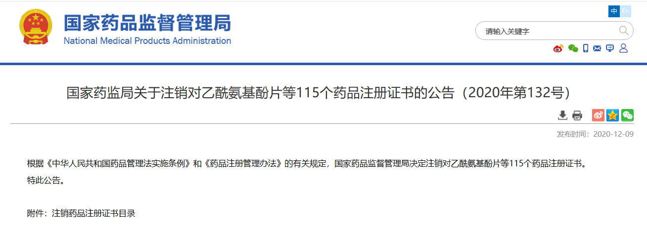 關(guān)于注銷對(duì)乙酰氨基酚片等115個(gè)藥品注冊(cè)證書(shū)的公告(2020年第132號(hào))