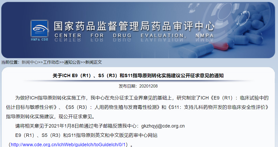 關(guān)于ICH E9(R1)、S5(R3)和S11指導(dǎo)原則轉(zhuǎn)化實(shí)施建議公開(kāi)征求意見(jiàn)的通知