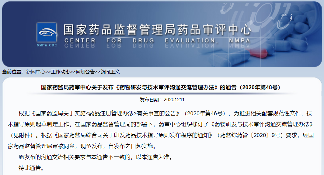 關(guān)于發(fā)布《藥物研發(fā)與技術(shù)審評(píng)溝通交流管理辦法》的通告(2020年第48號(hào))