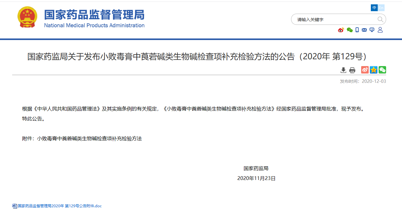 關(guān)于發(fā)布小敗毒膏中莨菪堿類(lèi)生物堿檢查項(xiàng)補(bǔ)充檢驗(yàn)方法的公告(2020年 第129號(hào))