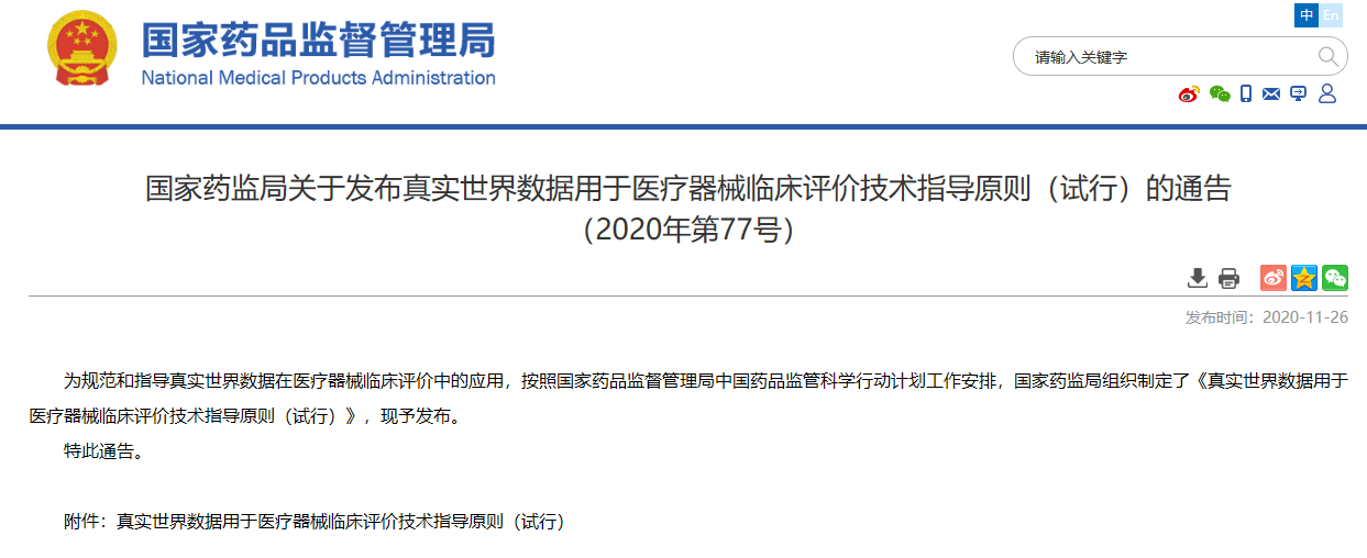 關于發(fā)布真實世界數(shù)據(jù)用于醫(yī)療器械臨床評價技術指導原則(試行)的通告(2020年第77號)