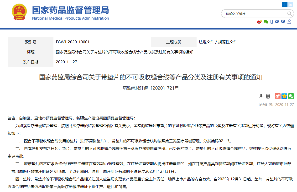 關于帶墊片的不可吸收縫合線等產(chǎn)品分類及注冊有關事項的通知 藥監(jiān)綜械注函〔2020〕721號
