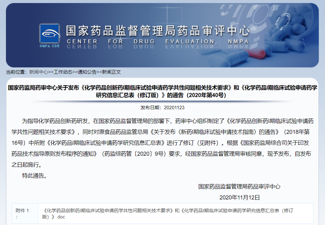 關于發(fā)布《化學藥品創(chuàng)新藥I期臨床試驗申請藥學共性問題相關技術要求》和《化學藥品I期臨床試驗申請藥學研究信息匯總表(修訂版)》的通告(2020年第40號)