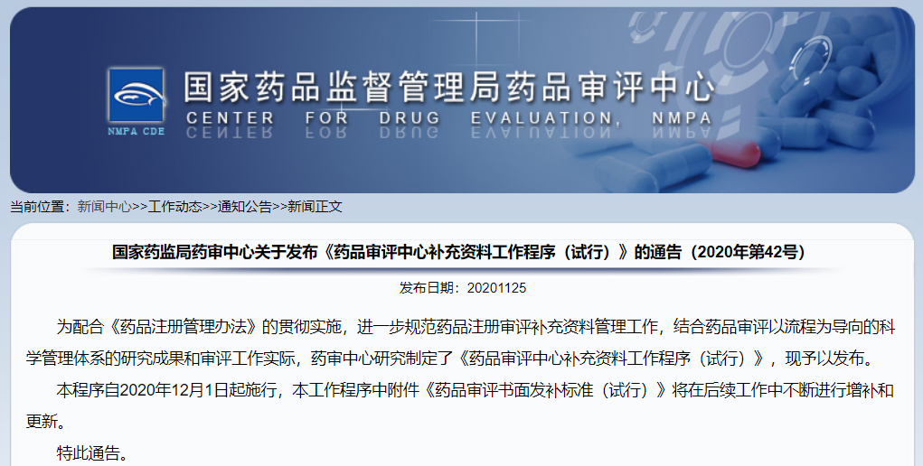 關于發(fā)布《藥品審評中心補充資料工作程序(試行)》的通告(2020年第42號)