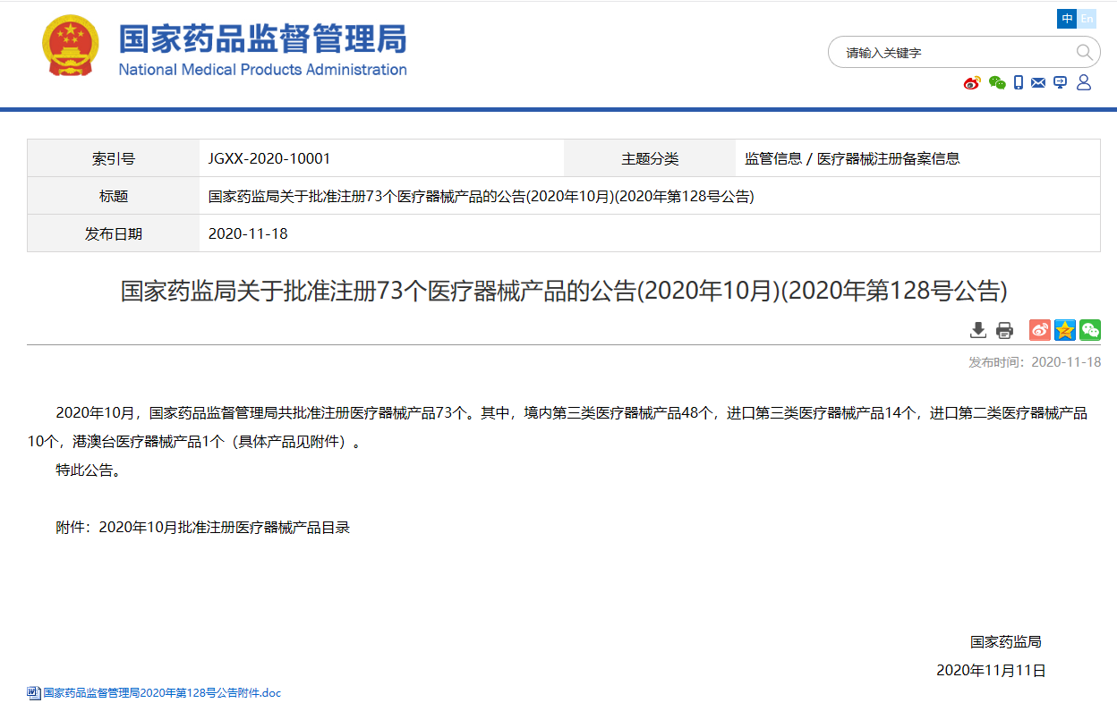 國家藥監(jiān)局關(guān)于批準注冊73個醫(yī)療器械產(chǎn)品的公告(2020年10月)(2020年第128號公告)