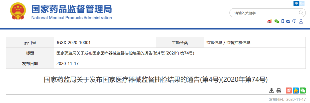 國家藥監(jiān)局關(guān)于發(fā)布國家醫(yī)療器械監(jiān)督抽檢結(jié)果的通告(第4號)(2020年第74號)